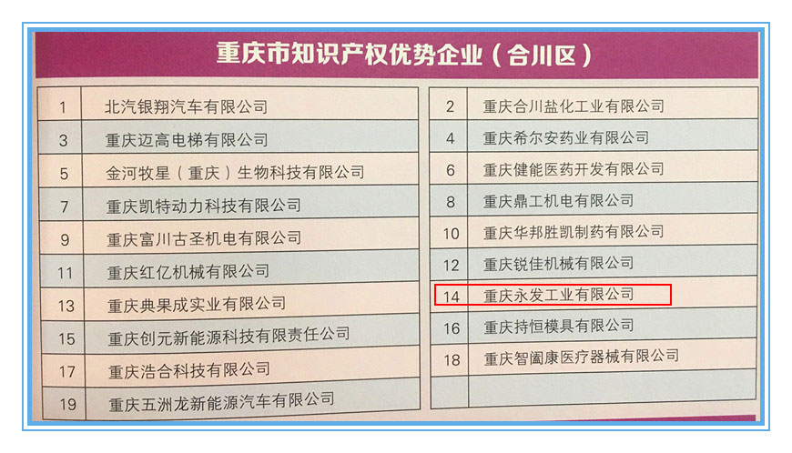 2017年12月,公司榮獲重慶市知識(shí)產(chǎn)權(quán)優(yōu)勢(shì)企業(yè)稱號(hào)