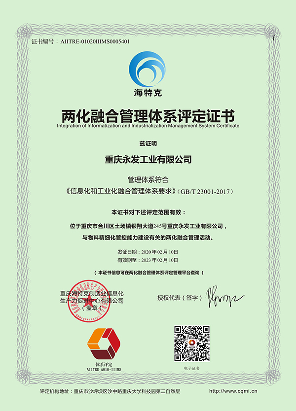 熱烈祝賀重慶永發(fā)工業(yè)有限公司于2020年2月10日通過兩化融合管理體系評定并取得證書。公司將一如既往繼續(xù)前進。