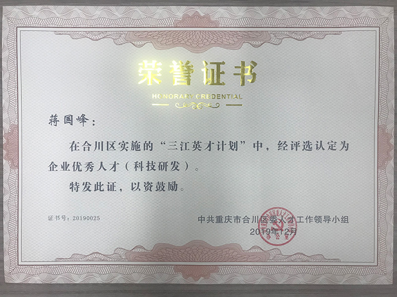 2019年12月,在合川區(qū)組織部開展的“三江英才”人才評定中,我公司蔣國峰總經(jīng)理獲得“企業(yè)科技研發(fā)人才”稱號